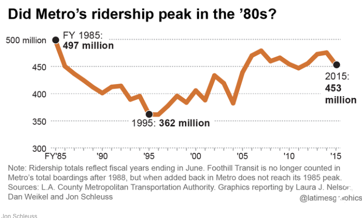Last week the Los Angeles Times ran a story, by Laura Nelson and Dan Weikel, about how transit ridership has declined in Southern California at the same time that large investments have been made in public transit, mostly in the rail system. The article led with the fact that Metro’s boardings declined 10 percent between 2006 and 2015, notwithstanding billions of dollars of capital expenditures, and that Metro had also experienced long-term declines in ridership, going back to when L.A. transit ridership peaked in 1985.